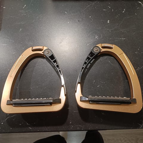 Mustat hyväkuntoiset Acavallo alupro jalustimet, ”sisäpuolelta” maali vähän kulunut, mutta ei vaikuta käyttöön.