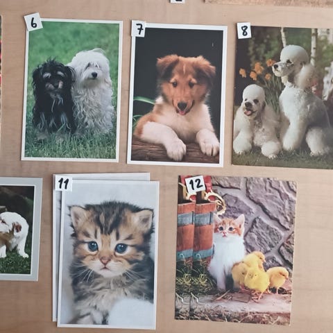 Kotieläimistä luonnonvaraisiin eläimiin on tässä nipussa Luojan luomia. Kortit ovat euron kappale. Postimaksu kirjeessä on 2,75 euroa 50 grammaan asti. Sen jälkeen 5,50 euroa.