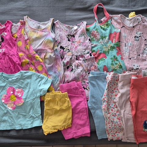 Tyttöjen iso vaatepaketti koossa 98-104. Paketissa 4 pitkähihaista, 2 t-paitaa, 1 mekko pitkillä hihoilla, 3 legginsit ja 3 svetaria.