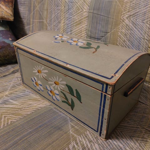 Myynnissä vanha, vaalean vihreä ompelulaatikko.