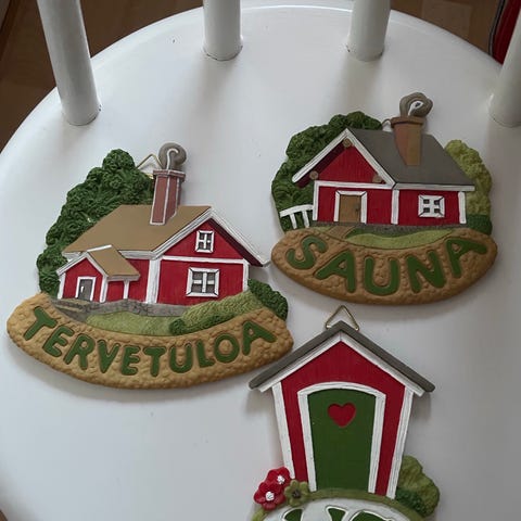 5 kpl erilaisia ovikylttejä, koko 28x12. Yhdessä kulmasta puuttuu vähä maalia