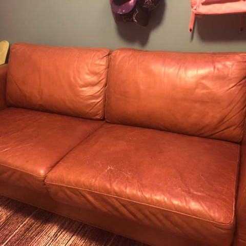 Nahkasohva istuinmekanismilla. Toisen puolen istuimen jousituksessa korjattavaa. Hyvä esim TV katsomiseen. Noudettava mahdollisimman pian