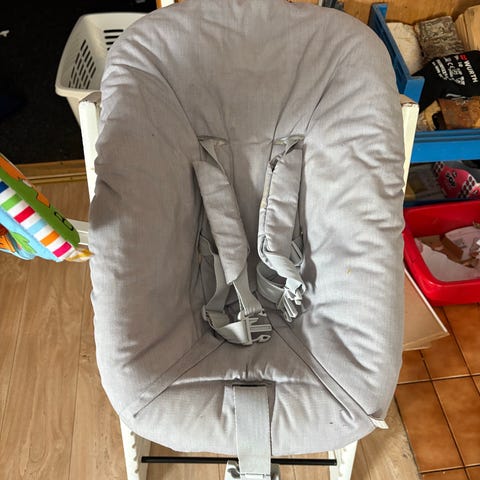 Stokken Tripp Trapp tuoliin vauvalle newborn setti. Pehmustettu istuin, jossa on turvavaljaat ja mitä voi kallistaa hieman. Väri harmaa/valkoinen.