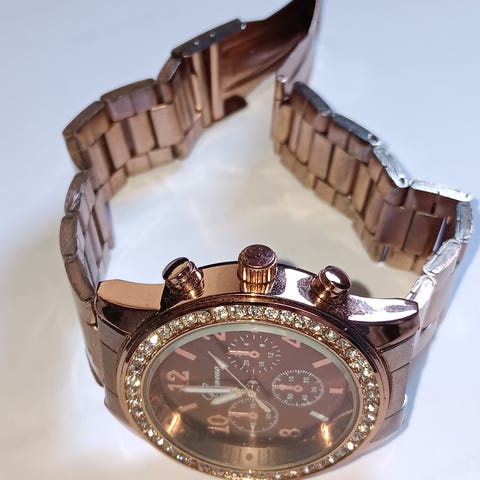 Geneva unisex rannekello. Kellossa on pyöreä kultainen kellotaulu ja metallinen kultasävyinen kuori. Analoginen näyttö tunti- ja minuuttiosoittimilla. Sopii käytettäväksi sekä naisille että miehille arki- tai juhlakellona.