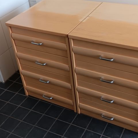Hyväkuntoinen täyspuu-laatikosto, vaaleanpunainen.