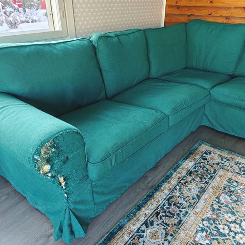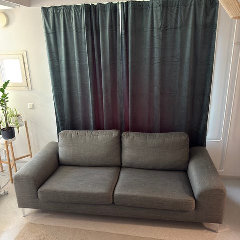 Meillä lemmikkejä. Ennen kauppoja putsataan mahdollisimman hyvin. Voimme auttaa kantamisessa. Sohvan saa kahteen osaan. Selkänoja tyynyt ovat irtonaisia.