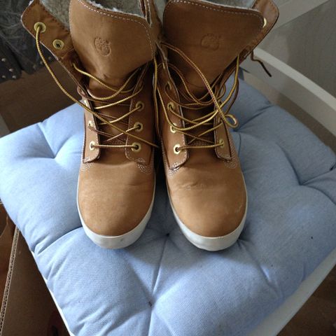 Timberland talvikengät, koko 39 - 40. Varren pituus polven alapuolelle, nauhakiinnitys edessä. Väri vaalea/valkoinen, ruskea kumipohja karkearakenteisella kuviolla. Kuvissa näkyy käytön jälkiä, pahimmista yritetty ottaa kuvat. Likaantumista erityisesti kantapäässä ja varressa. Erittäin lämpimät talvikengät vielä seuraavalle käyttäjälle.