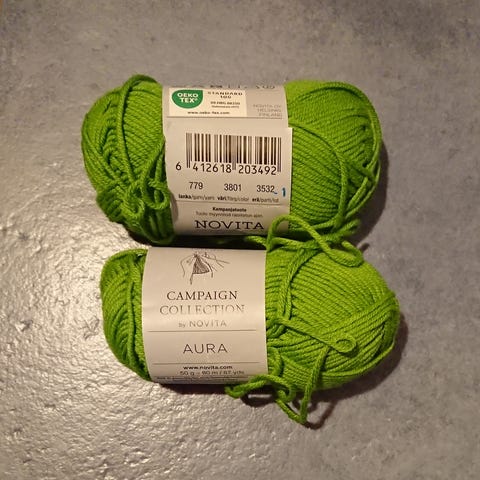 Kolme kerää violettia Novitan Aura-neulelankaa, väri 7701 ja erä 3532.