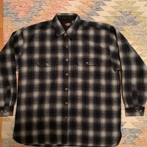 Skotlantilaisesta viyella-kankaasta valmistettu kauluspaita. 55/45 villa-puuvilla -sekoitetta. Tässä vielä kuninkaallisen hovihankkijan leima (Royal Warrant), mitä ei ole uudemmissa. Ainoa vika on pieni tahra toisen hihan napin vieressä, mikä ei näy kun hihan napittaa ja lähtenee pesussa pois. Ei kokomerkintää, mutta vastannee M-kokoa.