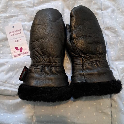 Myydään Käsinetorin lasten nahkarukkaset lammasturkisvuorilla. Muutaman kerran käytetty. On ollut meillä käytössä 4-5 vuotiaalla lapsella. Kokomerkintä 4. Käsinetorin sivuilta voi tutkia kokotaulukoita.