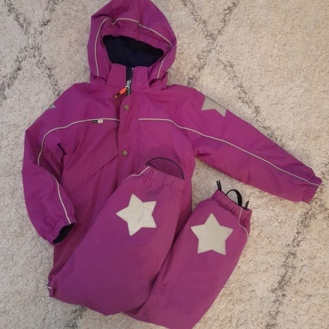 Molo toppahaalari henkseleillä. Koko 116. Sädetikku teki kaksi pientä reikää, jotka paikattu sydän paikalla. Lämmin haalari ja pitänyt kuivana. Yksi neppari puuttuu hupun reunasta. Hyvä käytetty kunto.