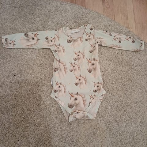 Metsolan yksisarvisbody, ihanassa vaalean mintun sävyssä. Koko 68 ja mielestäni vastaa hyvin kokoaan. Trikoo on napakkaa ja kunto moitteeton.