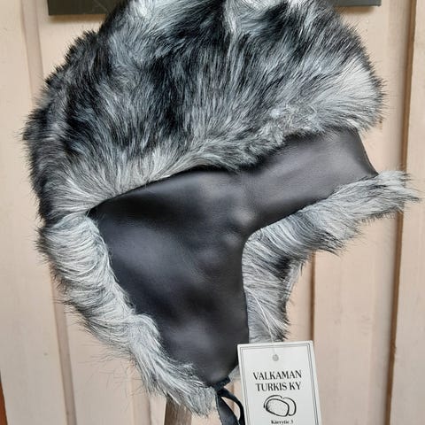 Käyttämätön lakki, luultavasti merkkiä Fredrikson. Sisäympärysmitta noin 57 cm. Lämmin. Kuten kolmannessa kuvassa näkyy, reunassa on aivan pieni kohta ilman turkista, mutta sitä ei huomaa käytössä.
