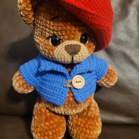 Huovutettu karhu-pehmo hakee nyt kotia. Korkeus 12,5 cm.