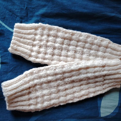 Novita 7 Veljestä neulottu säärystimet.Materiaalina villasekoitelanka, jossa on kuviollinen, kohopintainen neulos. Väri on sinapinkeltainen. Mitat näkyy kuvasta.