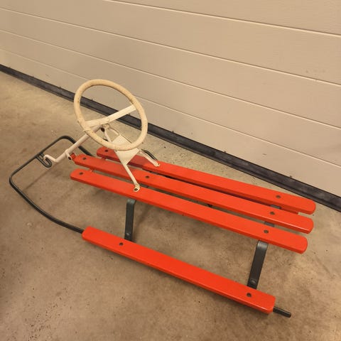 Vintage Plaston keltainen rattikelkka. Nouto.