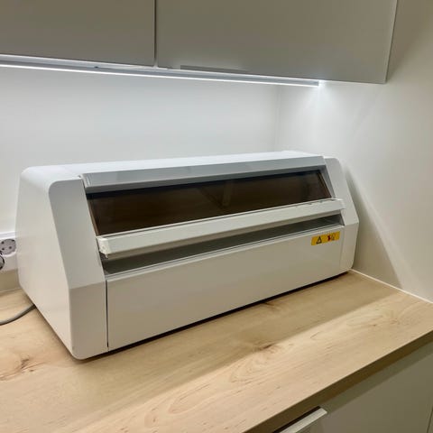 Kodin tekstiilejä käsittelevä pöydällä pidettävä mankeli