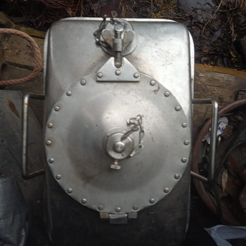 Retro, hyvä ja kunnossaoleva vanha uunipata, ilman puista nostokahvaa, sopivasti koristeluun tai käyttöön.