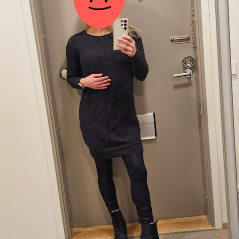 Hihaton neulemekko alpakanvillasta. Käytetty vain muutaman kerran. Ei näkyviä käytönjälkiä, vain pesulappu on lähtenyt purkautumaan. Pääntie on v-mallinen ja mekon voi pukea niin että syvempi pääntie tulee rintapuolelle tai selän puolelle. Helmassa on molemmissa sivusaumoissa pieni halkio. Väri on todella tumma. Tarkemmat materiaalitiedot ja pesuohjeet kuvissa. Mekon pituus n. 94 cm, puolikas vyötärön ympärys 38 cm (mitat venyttämättä). Nouto Kampista.