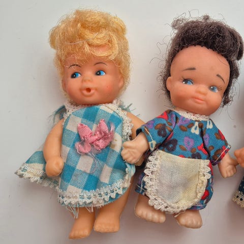 3kpl vanhoja nukkeja ,2kpl Ari nukkeja ,toiselta on joku pureskellut sormet ja vähän kenkien reunaa ,toinen ehjä.Nukke jolla on mekko on vanha, mutta merkkiä en tiedä.