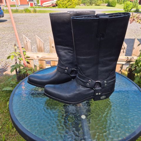 Nahkaiset länkkärisaappaat, koko 44. Väri ruskea, varressa koristeompeleet ja sisävuorissa kuviollinen kangas. Sopivat esimerkiksi arki- ja juhlakäyttöön tai teemapukeutumiseen. Unisex-malli, joka käy sekä naisille että miehille koon mukaan. Saumoissa kulumaa, mutta muuten hyvässä kunnossa