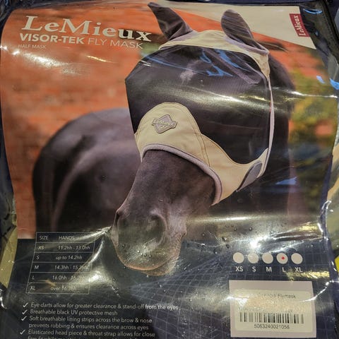Horze Cooling hyönteishuppu L, turpaosa leikattu pois. Toimii hyvin myös ratsastaessa, tarrassa todella hyvin säätövaraa laittaa myös suitsien päälle ja materiaali tosi kevyt. Otsatukan saa läpi hupusta, korvaosassa pehmeä materiaali. Hinta 6€