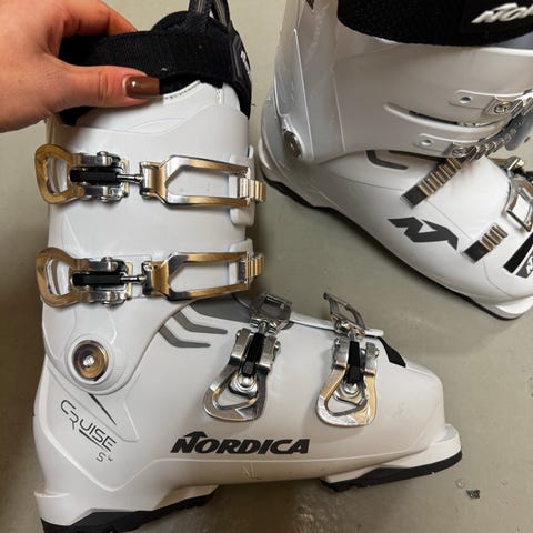 Nordica Cruise 70X laskettelumonot. Väri musta harmailla ja punaisilla yksityiskohdilla. Monossa on neljä säädettävää solkea ja power strap -remmi varren yläosassa. Laskettelu monojen koko:25.5-25.5 (295mm).