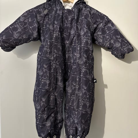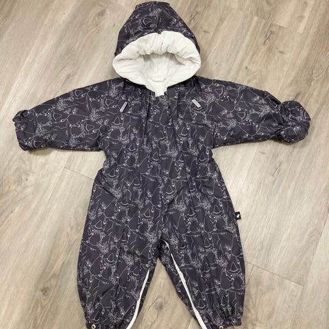 Moomin Reima haalari, koko 68-74. Harmaa-valkoinen kuosillinen unisex-malli. Vuori puuvillaa. Edessä on kaksi vetoketjua helpottamassa pukemista. Haarassa on myös vetoketju jonka avulla haalareita saa tehtyä makuupussin. Tällöin sopii käytettäväksi myös vastasyntyneelle. Myynnissä kaksi samanlaista.
