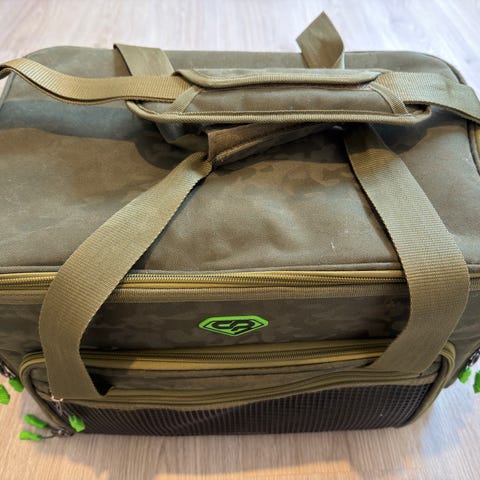 Savage Gears laukku kalastustarvikkeille. Laukussa on useita vetoketjullisia taskuja ja useita irrotettavia läpinäkyviä lokerikkoja vieheiden ja pienten tarvikkeiden säilytykseen. Kantamiseen on pehmustettu kantokahva sekä olkahihna. Väritys on vihreän ja mustan sävyinen oransseilla yksityiskohdilla. Soveltuu kalastusvälineiden järjestelmälliseen kuljettamiseen ja säilyttämiseen.
