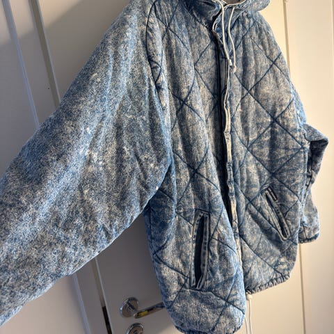 Tukevaa 100 % puuvilla-denimiä. Keskisininen. Metallinappikiinnitys edessä (5 nappia). Metallinapit myös edessä rintataskuissa, hihansuissa ja sivuilla helmassa. Kaikki napit tallella ja napinreiät ehjät.