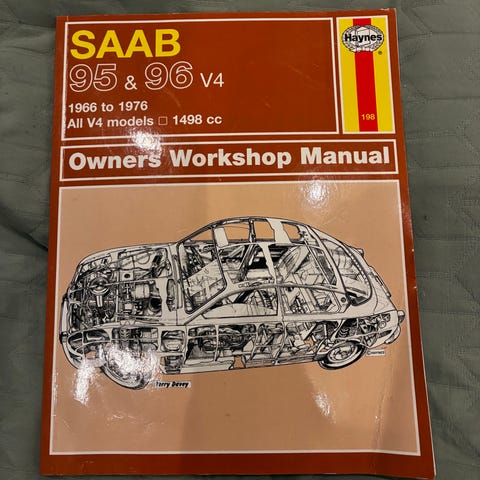 Saab 96/95 Saloon-Estate V4 OHV korjauskäsikirja. Painettu 1988 (4. Painos), 136 sivua. Kansissa kulumaa mutta sisäsivut kaikki tallessa ja erittäin hyvässä kunnossa (ei repeämiä, merkintöjä tai tahroja).