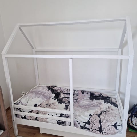 Myydään puinen Minitude talosänky. Patja ei kuulu kauppaan. Sängyn ulkomitat 79*168cm korkeus 174cm. Patjan koko 70*160 cm. Meillä 76cm leveä patj mahtunut. Lisäksi itse tehty sängynlaita mukaan jos haluaa. Tästä jäänyt ruuvijäljet runkoon (kuva) lisäksi rungossa puun oma jälki, ollut jo ostaessa. Säleikössä vahvistettu yhtä poikki puuta, tästä myös kuva. Sänky muuton vuoksi purettu kerran ja koottu uudestaan. Ohjeet mukaan. Voidaan purkaa tarvittaessa ja merkitä osat ohjeen mukaan.