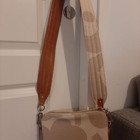 Marimekko Toivio Unikko laukku. Kangasta ja nahkaa. Siisti ja ryhdikäs paristi käytetty kunto, ainoa miinus pohjanahan sivussa muutama naarmu, saattaisivat kadota vahamaalla.