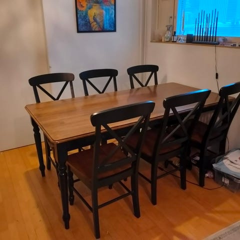 Ruokapöytä 90 x 135 + 40 cm ja 6 kpl tuolia, Pohjanmaan Kaluste (käytetty)
