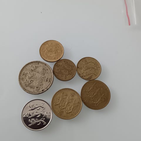 Eesti/ Viro kolikkoja 1 kroon- 5 senti seuraavasti: 1 kr 3+12kpl, 50s 5kpl, 20s 14+16kpl, 10s 17kpl, 5s 3kpl. Kaikki 70 kolikkoa 5 euroa.