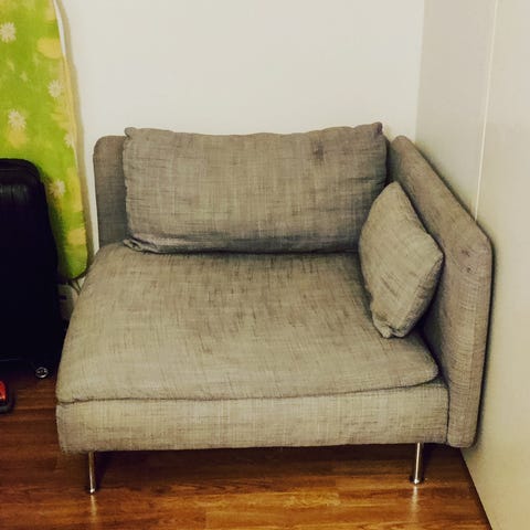 Söderhamn tuoli vihreällä päällisellä, kaikki päälliset pesty juuri. Väri kulunut kankaassa, mutta ehjä joka puolelta.