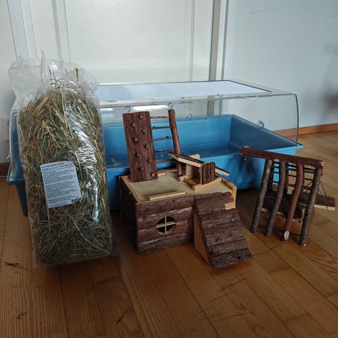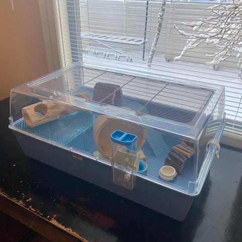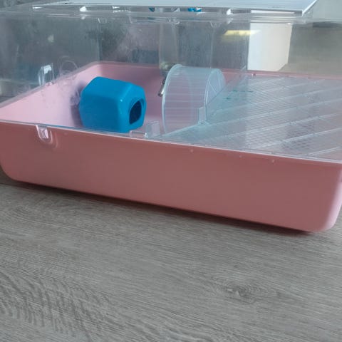 Muovinen hamsterihäkki, jossa sininen pohja ja läpinäkyvä yläosa. Häkissä on muoviset tunnelit, rampit ja tasot, jotka tarjoavat liikkumatilaa ja virikkeitä pieneläimelle. Yläosassa on verkko-osa ilmanvaihtoa varten sekä avattava luukku hoitoa ja siivousta helpottamaan. Soveltuu pienille jyrsijöille, kuten kääpiöhamstereille. Kannessa halkeama joka ei haittaa käyttöä.