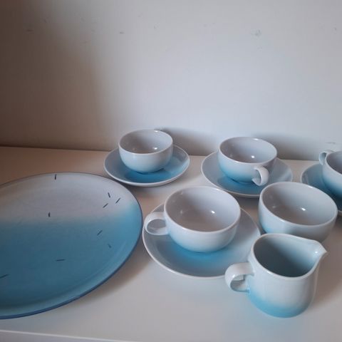 Pentikin Salvia teekannu, 4 kuppia aluslautasineen, sokerikko ja 2 kakkulautasta.
