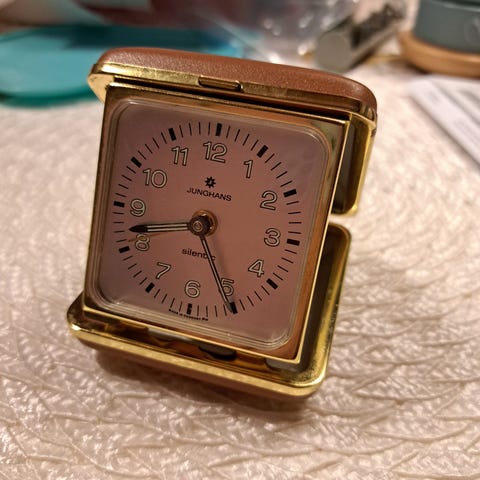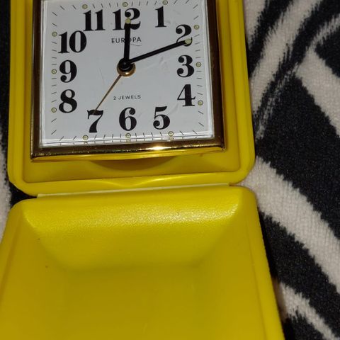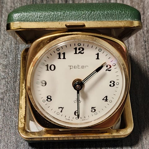 Peter matkakello, "made in Germany" ja "case made in West Germany". Käy ja soi kuten pitääkin. Muuten tosi hyvässä kunnossa, mutta näytössä on muutama naarmu, jotka valaistuksesta riippuen näkyy tai ei näy, ei haittaa käyttöä kuitenkaan. Numerot ja viisarit fosforoitu.