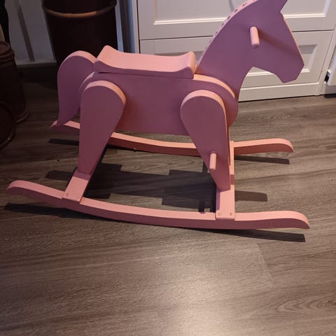 Puusepän valmistama mäntypuinen jämäkkä keinuhevone.