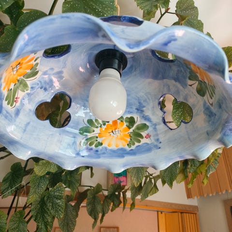 Vaaleanvihreä / limenvihreä kankainen kattolamppu.