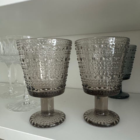Myydään kuusi kaunista vaaleanharmaata jalallista Kastehelmi-lasia, kyseessä väliväri.