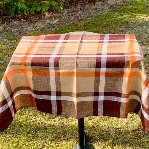 Pöytäliina ja kassi samaa materiaalia.
