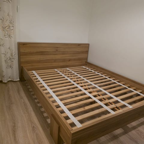 Valkoinen sänky, jossa korkea keinonahkainen ja koristetikkauksin viimeistelty pääty. Sängyn alla on vetolaatikot (6kpl), jotka soveltuvat esimerkiksi vuodevaatteiden tai muun kodintekstiilin säilytykseen. King-size, sopii kahdelle hengelle, leveys noin 200 cm. Patja on tosi hyvässä kunnossa.