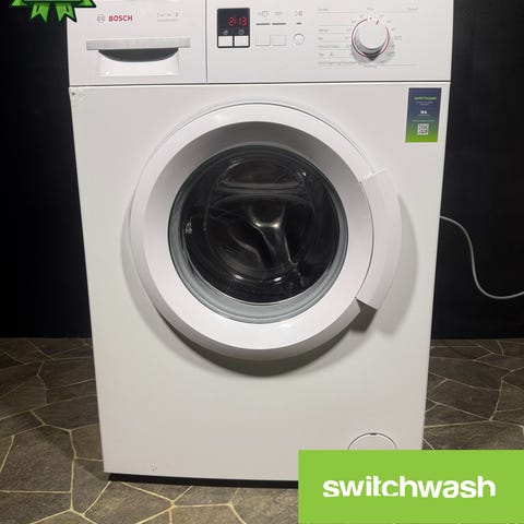 Bosch edestä täytettävä pesukone. Valkoinen vapaasti sijoitettava malli, jossa etuluukku ja digitaalinen näyttö.