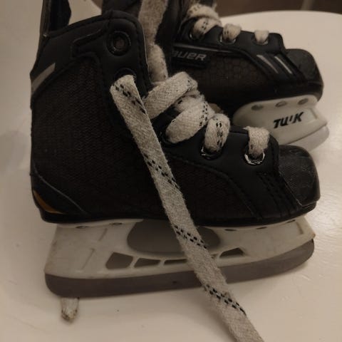 Bauer jääkiekkoluistimet lapsille. Väri musta, valkoiset nauhat ja valkoinen teräpidin. Terät metallia. Sopivat jääkiekkoharjoitteluun ja luisteluun jäähalleissa tai ulkojäällä. Sisältää luistin suojat (3€)