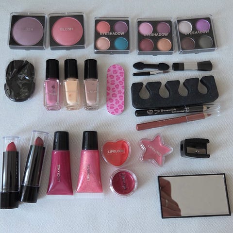 Paljon erilaista kosmetiikkaa, hiustuotteita ja meikkejä myytävänä. Myös kampa-harjasetti.