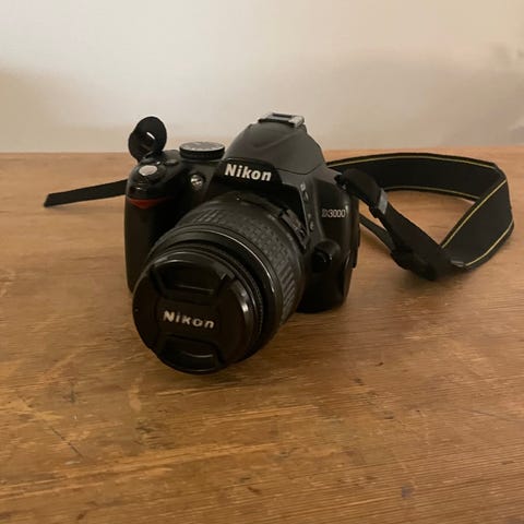 Nikon D3000 järjestelmäkamera mustalla rungolla. Kamerassa on irrotettava objektiivinsuoja sekä Nikon-kaulahihna. Lisäksi olkahihnallinen kameralaukku, jossa useita taskuja ja lokeroita kameran ja tarvikkeiden säilytykseen ja kuljettamiseen.