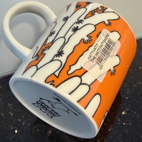 Muumimuki Hattivatit. Kruunuleima. Tullut tarrallisena minulle ja ollut sen jälkeen käytössä yhdessä lukuisien muiden mukien kanssa. Jotain pientä käytönjälkeä saattaa löytyä, selkeämmistä jäljistä ilmoituksissa lisäkuvat.