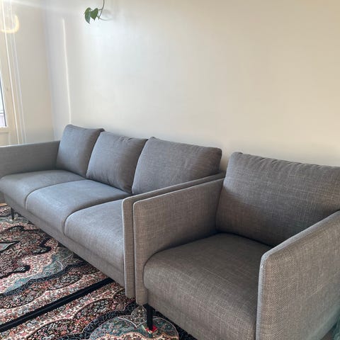 Suomalaisen Etellen valmistama laadukas sohvaryhmä vuodelta 2005. Sohvakalustossa on irroitettavat tyynynpäälliset, jotka voi pestä 60 asteessa. Itse olen pessyt 2-3 kertaa vuodessa, mikä vuoksi sohvaryhmä on säilynyt hyväkuntoisena ja puhtaana. Selkä- ja käsinojatyynyjen sisällä höyheniä ja jotain rouhetta. Tyynyt voi möyhiä takaisin kuosiin. Sohvan runko pesty tekstiilipesurilla kuukausi sitten. Käsinojatyynyt alunperin vetoketjukiinnityksellä. Vetoketjut eivät enää toimi eli on ollut irtotyynyinä käytössä. Leveämmän sohvan pituus 195 cm. Kapeamman 160 cm. Hinta erikseen ostettuna leveämmälle 150 € ja kapeammalle 100 €. Yhdessä ostettuna hinta 200 €.